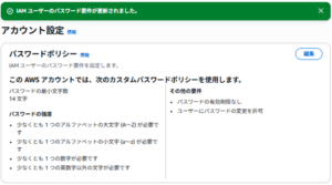 まず初めに IAM ユーザーのパスワードポリシーの設定を行います。